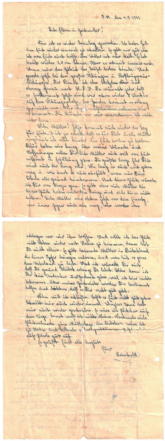 für Euch. Es ist ja schade daß es für Dich u. alle Mütter vergönnt ist alle Kinder um Euch herum zu haben. Dafür haben wir Krieg. Aber meine Wünsche und Hoffnungen sollen Dir, liebe Mutter auch weit von Euch entfernt in Erfüllung gehen. Die größte Sorge für Dich wird auch der Krieg sein. Wie lang er auch noch gehen mag u. wie hart er auch ausfällt, wenn nur Deine Söhne alle gesund heimkommen. Und dieses Glück wünsche ich Dir von Herzen gern. Es gibt aber viele Mütter die dieses Glück haben nach Kriege, und viele die es nicht haben. Liebe Mutter wir stehen jetzt vor dem Einsatz, wer unser Gegner auch sein mag, wir werden ihn schlagen wo wir ihn treffen.